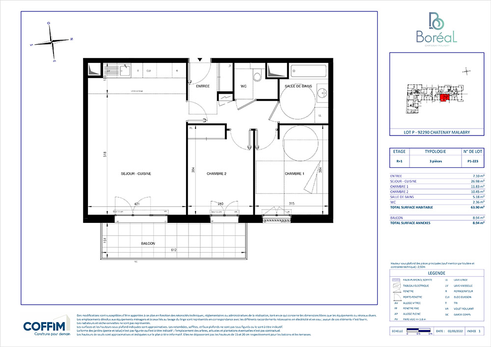 À Châtenay-Malabry au cœur de l’écoquartier LaVallée, dans une résidence neuve certifiée NF HABITAT HQE, à proximité du Parc de Sceaux, des commerces, des groupes scolaires et transports en commun (Tram T10 et RER B Croix de Berny), un appartement de type T3 comprenant une entrée avec placard, un séjour-cuisine de 26.98 m², deux chambres dont une avec placard, une salle de bain et un WC séparé. Le séjour et l’une des chambres donnent sur un balcon de 8.94 m². Le bâtiment est raccordé au réseau de chaleur urbain et à la fibre optique. Un ascenseur, un local vélo et un local poussette viennent compléter cette offre.